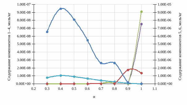 Рисунок 20 – Состав ПС на срезе сопла топлива АТ-НДМГ при разных значениях α: