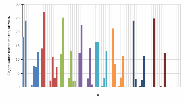 Рисунок 19 – Содержание компонентов на срезе сопла при разных значениях α (АТ-НДМГ)