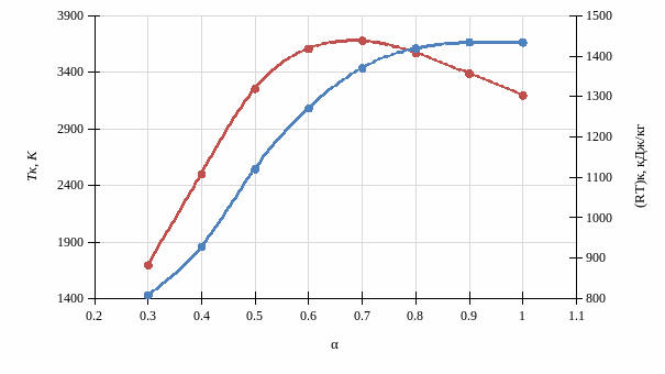 Рисунок 17 – Зависимость Tк (1) и (RT)к (2) от α (кислород-метан)