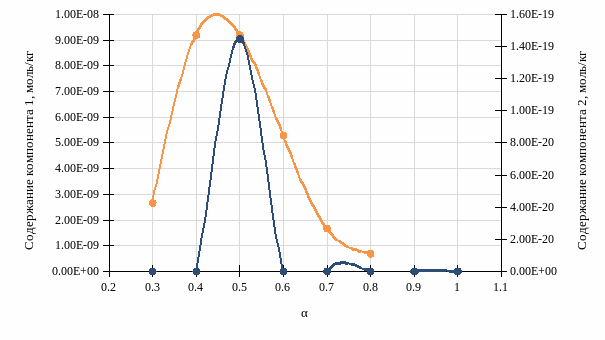 Рисунок 13 – Содержание компонентов на срезе сопла при разных значениях α (кислород-метан)