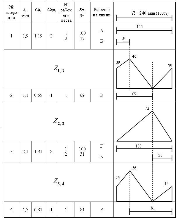 Недогруженные станки на 1-ой и 4-ой операциях может обслуживать один рабочий – совместитель Б, а не 2-ой и3-ей операциях – рабочий В. Совмещаемые работы могут выполняться только в последовательности, определяемой планом – графиком работы линии.