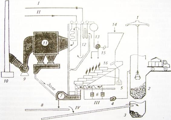 1 – мостовой грейферный кран; 2 и 3 – мусорный и шлаковый отсеки бункера–накопителя; 4 – вентилятор первичного дутьевого воздуха; 5 –станция гидропривода; 6 – паровые калориферы-воздухоподогреватели; 7 – шлакоизвлекатель; 8 – ленточные транспортеры для удаления шлака и золы; 9 – дымосос; 10 – дымовая труба; 11 – электростатический филтр; 12 – котел-утилизатор; 13 – вентилятор вторичного воздуха; 14 – загрузочный бункер; 15- растопочная горелка; 16 – колосниковая решетка; I – пар; II – вода; III – воздух; IV – шлак