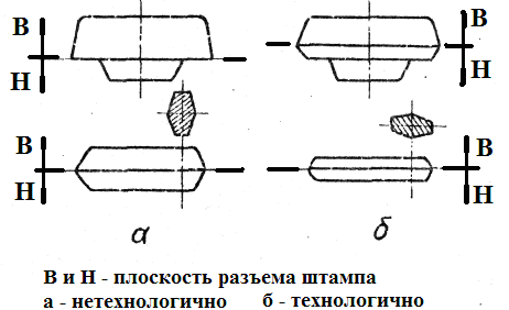 | Плоскость (поверхность) разъема штампа должна быть такой, чтобы поковка легко вынималась из штампа. | ||