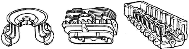 Сложные по конфигурации отливки получают литьем под давлением, по выплавляемым моделям, в песчаных формах. Литьем в кокиль получают отливки с простой наружной конфигурацией, а центробежным литьем – отливки типа тел вращения. Наиболее тонкостенные отливки получают литьем по выплавляемым моделям и литьем под давлением.