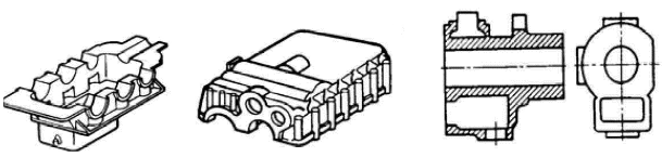 | В зависимости от конфигурации изделия и необходимого количества стержней отливки делят на шесть групп сложности. Примеры типовых конструкций отливок различной сложности |