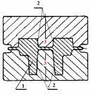 | Рис. 4 Выбор плоскости разъема штампа а – штамповка в торец; б – штамповка плашмя 1 – поковка; 2 – наметки отверстия в поковке; 3 – выступы штампов (знаки) | |
