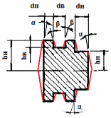 Рис. 10 Наружные и внутренние уклоны при штамповке плашмя | hн и dн – соответственно глубина и ширина полости штампа, формирующей наружную поверхность поковки; hв и dв - соответственно глубина и ширина полости штампа, формирующей внутреннюю поверхность поковки; α - уклон на наружной поверхности поковки; β - уклона на внутренней поверхности поковки. |