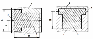 | Рис. 5 Выбор плоскости разъема штампа 1 – верхний штамп; 2 – нижний штамп; 3 – поковка; 4 – плоскость разъема штампа; D и В – наибольшие габаритные размеры поковки; h и H глубины полости штампа при различных положениях поковки. а – технологично, т.к. плоскость разъема штампа совпадает с плоскостью двух наибольших габаритных размеров штампованной поковки; б – нетехнологично, т.к. плоскость разъема штампа не совпадает с плоскостью двух наибольших габаритных размеров штампованной поковки и полость штампа имеет большую глубину по сравнению с вариантом «а» (H ˃ h). |