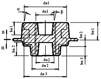 | Рис. 11 Наружные и внутренние уклоны при штамповке в торец | hн и dн – соответственно глубина и ширина полости штампа, формирующей наружную поверхность поковки; hв и dв - соответственно глубина и ширина полости штампа, формирующей внутреннюю поверхность поковки; α - уклон на наружной поверхности поковки; β - уклона на внутренней поверхности поковки. |