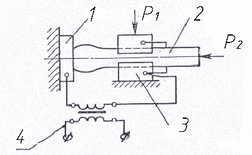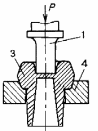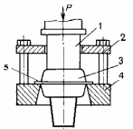 | Рис. 65Д Высадка на электровысадочных машинах | Исходная заготовка – труба, пруток. Исходная заготовка 2 подается до упора 1 и зажимается в радиальном скользящем электроконтакте 3 усилие Р1. Через исходную заготовку пропускается электрический ток. Источником переменного тока является трансформатор 4. Ток нагревает участок исходной заготовки, находящийся между электроконтактом 3 и упором 1.При достижении определенной температуры производится осадка заготовки 2 с усилием Р2. В результате осадки нагретая концевая часть исходной заготовки деформируется. Продукция. Валы и трубы с концевыми утолщениями. |
