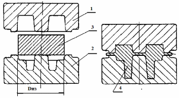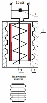 Рис. 66Д Электромагнитная штамповка (штамповка в импульсном магнитном поле) | Электромагнитная штамповка основана на преобразовании электрической энергии в механическую. Полая исходная заготовка 2 устанавливается в зазор между разъемной матрицей 1 и соленоидом (индуктором)* 3. При разряде батареи конденсаторов 4 (время разряда 40-50 мкс) на соленоид 3 вокруг соленоида возникает мгновенное магнитное поле высокой мощности. Это магнитное поле наводит вихревые токи в трубчатой токопроводящей исходной заготовке 2, которые, возникнув, также создают свое магнитное моле. Взаимодействие магнитных полей вихревых токов с магнитным полем индуктора приводит к отталкиванию исходной заготовки от индуктора со скоростью 200 – 300 м/с. Исходная заготовка 2 ударяется о разъемную матрицу 1, деформируется и принимает форму ее внутренней полости. Особенность электромагнитной штамповки - высокая скорость деформирования *Соленоид (индуктор) – спиральные витки из токопроводящего материала. Продукция. Листовые и трубчатые штампованные поковки толщиной до 5 мм |