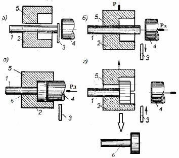 Рис. 46Д Штамповка на горизонтально-ковочной машине (ГКМ) При штамповке на ГКМ применяются многоручьевые закрытые штампы, состоящие из пуансона и разъемных матриц. Пруток 1 нагретым концом укладывается в неподвижную половину матрицы 2 и подается до упора 3. Пуансон 4 в это время находится в крайнем правом положении (рис. 46Д , а). Затем (рис. 46Д, в), пуансон 4 деформирует конец прутка с усилием Рд до тех пор, пока не образуется готовая поковка. После этого (рис. 46Д, г) подвижная часть матрицы 5 и пуансон 4 отводятся в первоначальное положение. Штампованная поковка 6 извлекается из штампа. Упор 3 занимает исходное положение. Цикл штамповки повторяется. Основной операцией при изготовлении поковок на ГКМ является высадка, часто сопровождающаяся прошивкой. |