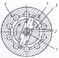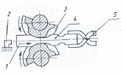 | Рис. 62Д Штамповка на ротационно-ковочных машинах | Исходная заготовка – пруток, труба. Штамповка на ротационно-ковочных машинах заключается в местном обжатии исходной заготовки по периметру Исходную заготовку 1 в виде прутка или трубы помещают в отверстие между бойками 2 машины, находящимися в шпинделе 3. Бойки могут свободно скользить в радиально расположенных пазах шпинделя. При вращении шпинделя ролики 4, помещенные в обойме 5, толкают бойки 2, которые наносят удары по заготовке. В исходное положение бойки возвращаются под действием центробежных сил. Процесс ведется как в холодном , так и в горячем состояниях. Продукция. На легких ротационно-ковочных машинах обрабатывают швейные иглы диаметром до 0,3 мм, а на тяжелых – стальные трубы диаметром до 320 мм и сплошные ступенчатые валы диаметром до 250 мм. | |