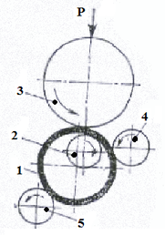 | Рис. 63Д. Раскатка | Исходная заготовка - кольцо с меньшим диаметром и большей толщиной стенки, чем у получаемой поковки. При подведении к исходной заготовке 1, надетой на валок 2, быстро вращающегося валка 3 заготовка и валок 2 начинают вращаться. При дальнейшем сближении валков 2 и 3 под действием силы Р увеличивается наружный диаметр исходной заготовки в результате уменьшения толщины стенки и происходит ее контакт с направляющим роликом 4, обеспечивающим получение правильной кольцевой формы наружной поверхности поковки. После касания поковкой контрольного ролика 5 раскатка прекращается. Продукция. Кольца ( в том числе кольца подшипников) с наружным диаметром 70…700 мм и шириной 20…180 мм. | |