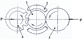 | Рис. 64Д Накатка зубчатых колес | Поверхностный слой исходной цилиндрической заготовки 1 с помощью индуктора 2 нагревается током высокой частоты (ТВЧ). Валок 4 , имеющий форму зубчатого колеса, получает принудительное вращение и поступательное перемещение под действием силы Р. Валок 4 вдавливается в заготовку 1 , формируя в ней профиль зубьев. Ролик 3, свободно вращаясь на валу, формирует внешнюю поверхность зубьев. Поверхностный нагрев повышает износостойкость и усталостную прочность зубьев. |