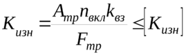 где Aтр - работа трения муфты за одно включение; nвкл –число включений муфты в минуту (наибольшее число включений соответствует паспортному числу одиночных ходов пресса в минуту nод.х); kвз –коэффициент взаимного перекрытия; для муфт с кольцевыми накладками kвз=1; Fтр – суммарная площадь трения фрикционных накладок или вставок; [Kизн] – допустимое значение показателя износа, Дж/(м2 ∙мин). Физический смысл показателя износа – допустимая удельная работа трения фрикционных поверхностей муфты при паспортном числе одиночных ходов пресса.