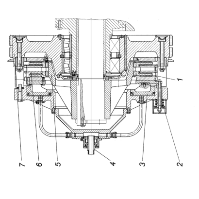 | Рис. 1.1. Двухдисковая муфта с кольцевыми накладками. 1 – ведомый диск с кольцевыми накладками; 2 – раз- жимающая пружина; 3 – кольцевой поршень с ведущим нажимным диском; 4 – воздухоподводящая головка; 5 – ступица; 6 – ведущий промежуточный диск; 7 – зубчатое колесо сведущим опорным диском. |