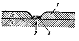 Рис. 5. Коррозия цинкового покрытия на стали: 1 — анод; 2 — катод; 3 — продукты коррозии