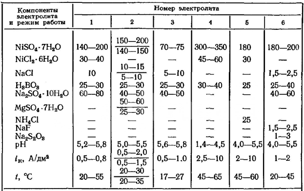 1.Сульфатный электролитический раствор. В промышленности используется большой перечень сульфатных электролитов, позволяющих иметь на поверхности изделий осадки с заданными физическими показателями. Сульфат натрия характеризуется большой электропроводностью, за счет включения в раствор магния никелирование становится более пластичным и мягким. В качестве буферного химического элемента применяется борная кислота, она регулирует показатели кислотности как в общем растворе, так и в области непосредственной близости к катоду. В связи с тем, что никелевые аноды пассивируются, в электролиты обязательно добавляются ионы хлора. Строгое соблюдение технологических режимов и химических составов гарантирует надлежащее качество никелирования.