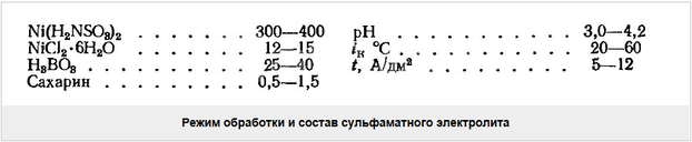 2.Сульфаматный раствор для никелирования. Основной компонент – сульфамат никеля, для депассивации покрытий электродов добавляется борная кислота или хлорид никеля. За счет высокой концентрации удается увеличить токи плотности никелирования. Никель осаждается равномерным гладким слоем, количество мини-пор уменьшается. Покрытия малонапряженные, никель можно осаждать толстым слоем. Электролитический раствор используется в гальванопластике и иных специальных случаях во время производства ответственных деталей. Недостатки – сложность технологии, обязательное перемешивание и очистка, высокая стоимость.