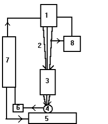 1 — технологический лазер; 2 — лазерное излучение; 3 — оптическая система; 4 — обрабатываемая деталь; 5 — устройство для закрепления и перемещения детали; 6 — датчики параметров технологического процесса; 7 — программное устройство; 8 — датчики параметров излучения.