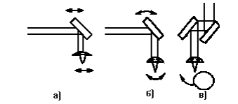 а — перемещение отклоняющего зеркала вдоль детали; б — колебания отклоняющего зеркала; в — круговое вращение системы зеркал