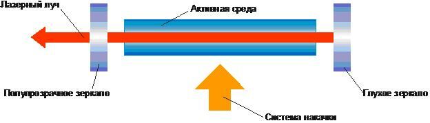 Рабочее тело помещается в оптический резонатор. Самый простой из них состоит из двух параллельных зеркал, одно из которых полупрозрачное. Часть света оно отражает, а часть пропускает. Отражаясь от зеркал, пучок света возвращается обратно и усиливается. Это процесс повторяется многократно. На выходе из лазера образуется очень мощная световая волна.