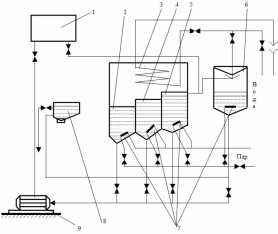 Рис. 1.6. Схема установки для обезжиривания пластин с каскадными ваннами: 1 — напорный бак; 2, 4, 5, — нижняя, средняя и верхняя ванны; 3 — охлаждающий змеевик; 6 — перегонный куб; 7 — подогреватели; 8 — отстойник; 9 — насос.