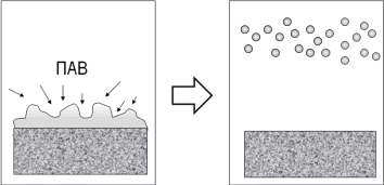 Поверхностное натяжение мыльных растворов составляет всего 30 - 40 эрг/см2 (вместо 73 эрг/см2 для чистой воды), что обеспечивает хорошее смачивание деталей и облегчает отрыв капелек жира. Например, обезжиривание поверхности медной фольги печатных плат осуществляется в растворе: