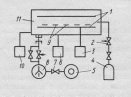 высокочастотной системой: 1 – электроды; 2 – натекатель; 3 – блок управления ВЧ источника питания; 4 – система откачки; 5 и 8 – механический и диффузионный насосы; 6 – блок управления последовательностью операций; 7 – вентиль; 9 – подложка; 10 – регулятор давления; 11 – рабочая камера