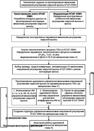В главе определены структура, состав и задачи системы управления механизмом оперативной регулировки закрытой высоты пресса. Также представлена блок-схема методики проектирования механизма регулировки закрытой высотой КГШП 25МН с адаптивной системой управления.