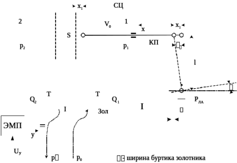 Под действием малого перепада давлений p в полостях силового цилиндра ( p = p1 - p2 0), без учета трения и инерционности подвижных частей рулевой машинки, поршень со штоком силового цилиндра начнет перемещаться влево (х - перемещение штока силового цилиндра). Поскольку золотник - это регулируемый гидравлический дроссель то в соответствии с (2) можно считать p0 pц p′ и p0 p′ , где р0 – давление на входе золотника, p′ - давление в магистрали слива.