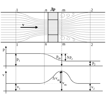 В дросселе Др струя жидкости сжимается, ее скорость v увеличивается, а давление p уменьшается. Процесс дальнейшего внезапного расширения струи жидкости за дросселем сопровождается интенсивными гидравлическими потерями, вызванными вихревыми образованиями и кавитацией в зоне непрерывного течения.