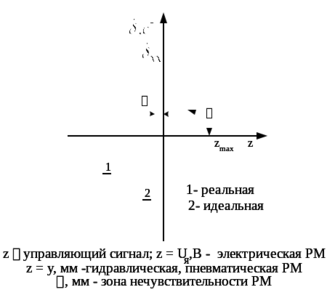Насыщение скоростной характеристики при значении zmax обусловлено ограниченным размером окна золотника ymax . Для предотвращения утечек жидкости через золотник при отсутствии управляющего сигнала (Uу = 0) поршни золотника имеют буртики, перекрывающие окна трубопроводов, что приводит к появлению в реальной скоростной характеристике рулевой машинки зоны нечувствительности .