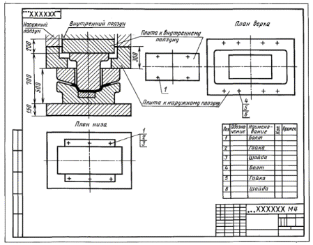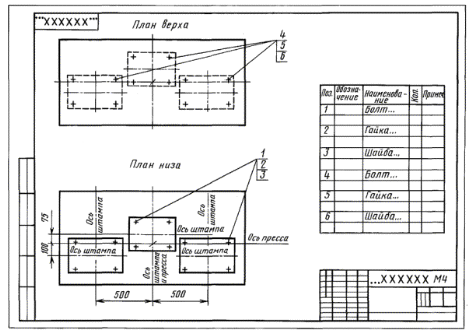 4.1.28. На сборочном чертеже штампа и блока размеры расстояний между направляющими колонками (втулками) следует наносить только на плане низа.