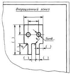 4.1.29. В случае, когда в данном штампе изготовляется не окончательно готовая штампуемая деталь, а заготовка для последующей̆ штамповки, и какие-либо размеры этой̆ заготовки на операционном эскизе подлежат уточнению по результатам обработки в следующем штампе, необходимо заключить такие размеры в круглые скобки рис.16 и в тексте под операционным эскизом привести запись: «Размеры в скобках уточнить в ... штампе ...» (указать наименование и обозначение следующего штампа).