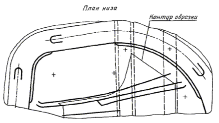 4.2.1.1. На чертеже формоизменяющего штампа, предназначенного для изготовления деталей сложной пространственной формы, следует на плане низа изобразить сплошной тонкой линией контур обрезки штампуемой детали и на полке линии-выноски поместить надпись «Контур обрезки» рис.17.