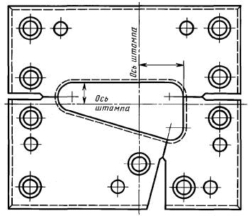 2.2.4. В случае, когда на чертеже основной детали невозможно или нецелесообразно указать все размеры, необходимые для ее изготовления, в технических требованиях чертежа следует приводить запись по типу: «Рабочий контур выполнить по чертежу штампуемой детали» или «Рабочий контур выполнить по шаблону, изготовленному по чертежу штампуемой детали». При этом на изображении должны быть нанесены размеры, координирующие контур относительно осей штампа рис.19, и чертежи сопрягаемых деталей должны быть оформлены в соответствии с требованиями п. 2.2.2 .