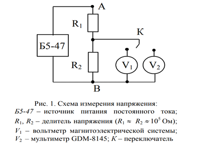 Вольтметр магнитоэлектрической системы М2044 (или аналогичный); цифровой мультиметр серии GDM-8145; источник питания постоянного тока Б5-47; панель с делителем напряжения.