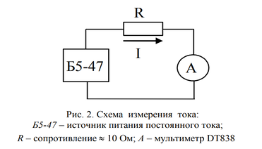 Амперметр – цифровой мультиметр DT838 (или аналогичный); источник питания постоянного тока Б5-47; панель с сопротивлением R ≈ 10 Ом.