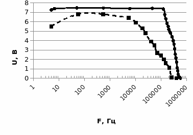 По результатам видим, что напряжение до определенного значения возрастало, далее значение напряжение постоянно до некоторого значения, а после него резко падает. Амплитудно-частотная характеристика, полученная экспериментально, имеет точно такой же характер, как и предполагалось. Согласно паспортным данным: