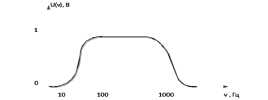 Я предлагаю для определения полосы пропускания вольтметров найти зависимость их показаний от частоты гармонических колебаний. Примерный теоретический вид амплитудно-частотной характеристики приведен на рис.1