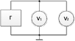 Рисунок 2. Схема для получения частотной характеристики вольтметров: Г – генератор гармонических колебаний GFG; V1 – цифровой мультиметр GDM-8145; V2 – цифровой мультиметр VC97
