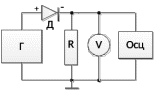 Рисунок 6. Схема для измерения напряжения сигналов сложной формы. Г - генератор GFG, R - сопротивление 1 кОм, Д - полупроводниковый диод, ОСЦ - осциллограф Textronix, V - мультиметр GDM-8145