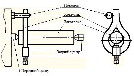 Рис. 3. Схема установки заготовки в центрах с хомутиком и поводком