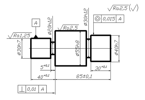 На рис. 2 изображен вал с требованиями к перпендикулярности торца и соосности шейки 40 h7 относительно наружной цилиндрической поверхности 30 h7