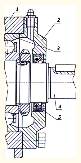 Рис. 5. Часть корпуса вентиляционной установки с крышкой и подшипником: 1 – корпус насоса; 2 – крышка подшипника задняя; 3 – подшипник качения; 4 – вал; 5 – манжета
