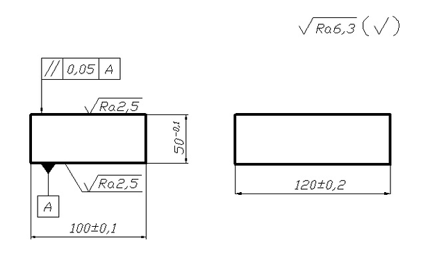 На рис. 1 изображен эскиз призматической детали с требованием к точности взаимного расположения плоскостей. К верхней плоскости данной детали предъявлено требование параллельности относительно базы А (нижняя плоскость). При обработке фрезерованием верхней плоскости, заготовку базируют на противоположную ей плоскость, базу А (первый технологический прием, см. выше). Таким образом, измерительная база А одновременно становится и технологической, т.е. при построении технологического процесса соблюдается принцип совмещения баз.