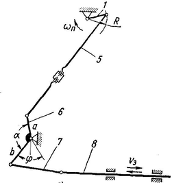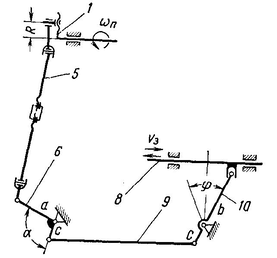 На рис.б приведена схема кривошипно-рычажного механизма. Здесь регулируемый кривошип 7, приводимый в движение от главного вала машины или от вала отбора мощности, соединен с шарнирной тягой 8, позволяющей передавать движение во взаимно перпендикулярных плоскостях, и рычагом 9, связанным с механизмом периодического движения 10.
