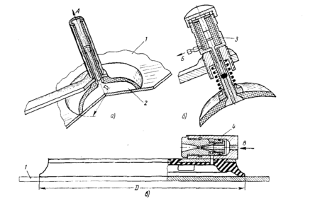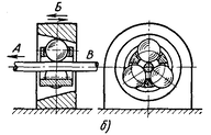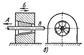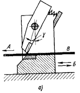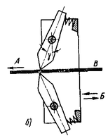 Схемы ножевого одностороннего (а) в двустороннего (б) захватных органов:А — Направление движения материала Б — движение подвижной каретки; 13 — заготовка